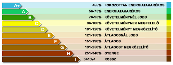A vizsgált lakóépületek az energetikai tanúsítvány kiállítása során a fenti skálán látható besorolás szerint kerülnek osztályozásra; a legjobb “A+” kategóriától a legrosszabb “I” kategóriáig.